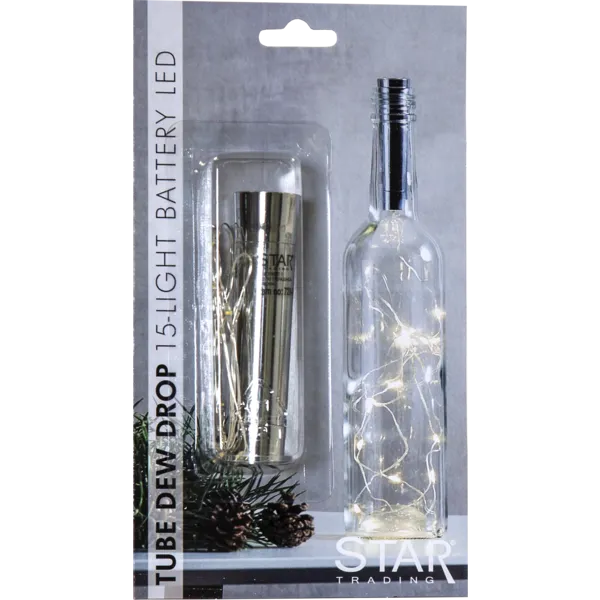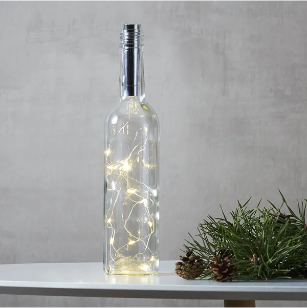 Star Tradingin LED-valosarja pullon sisään on helppo ja näyttävä tapa luoda tunnelmallinen koristevalo. Ohut valolanka sujautetaan tyhjään lasipulloon ja hopeanvärinen korkki jää siististi pullon suulle.Valosarjaa voit käyttää myös moneen muuhun tarkoitukseen. Lämminsävyiset LED-valot loistavat kauniisti ja luovat pehmeää, kimaltavaa valoa esimerkiksi juhlapöytään, ikkunalle tai hyllylle. Paristokäyttöisenä valosarja on helppo sijoittaa minne tahansa!