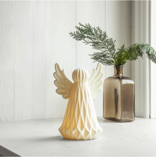 Star Tradingin Vinter-enkeli säteilee rauhaa ja lämpöä pehmeän LED-valon loisteessa. Kauniisti muotoiltu, mattapintainen keramiikkaenkeli sopii täydellisesti luomaan pehmeää ja sydämellistö tunnelmaa. Enkelin sisällä oleva lämmin LED-valo valaisee hennosti sen koristeellista pintaa ja luo lempeää hehkua ympärilleen. Paristokäyttöisenä enkelin voi sijoittaa minne tahansa ilman johtoja, vaikkapa ikkunalaudalle, lipaston päälle tai joulupöydän koristeeksi. Ajastintoiminto sytyttää ja sammuttaa valon automaattisesti.